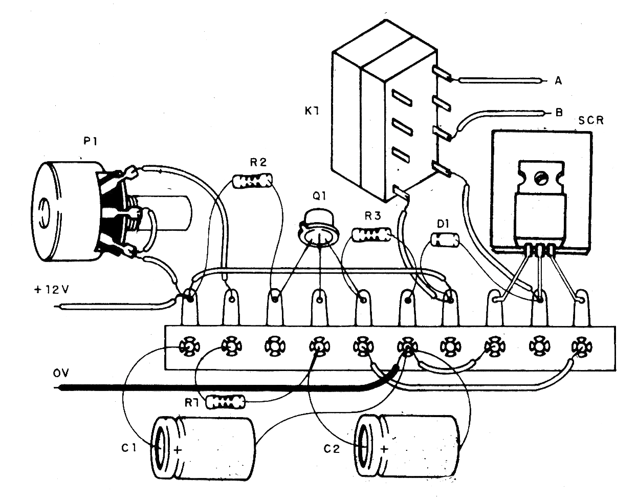 La alimentación del circuito se realiza con una tensión de 12 V obtenida de una fuente y el relé utilizado debe ser del tipo sensible de 12 V con contactos de acuerdo con la carga que debe ser accionada. El circuito consiste en un oscilador con transistor unijuntura que dispara un SCR. En la figura 1 tenemos el diagrama completo de la llave de retardo.