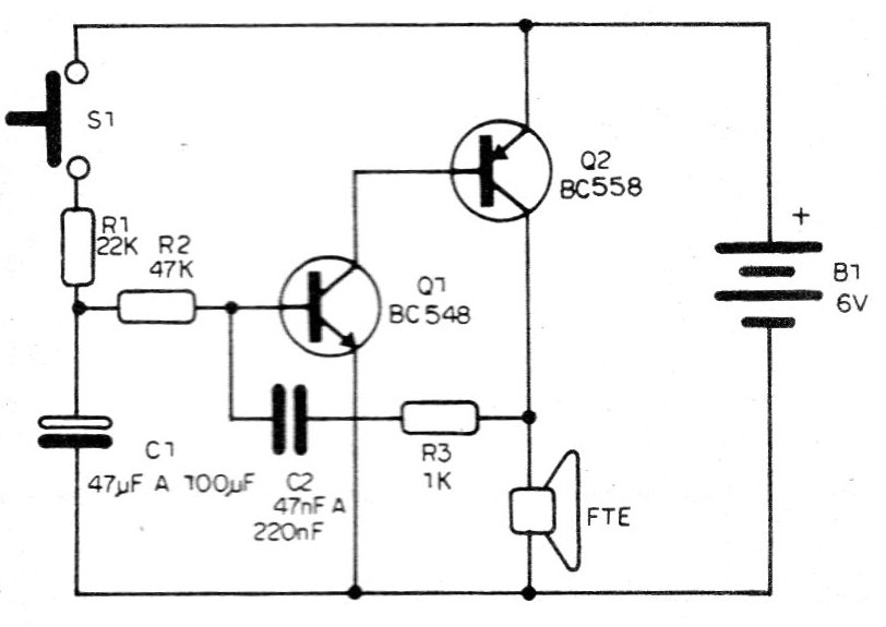 El circuito funciona, en su versión básica, con 4 pilas comunes y, cambiando Q2 por un transistor de mayor potencia, como el TIP32, podemos alimentarlo con 12 V, obteniendo mayor intensidad de sonido.