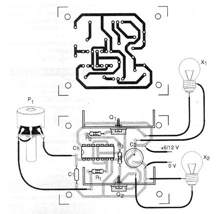 El circuito de la figura 1 hace que dos lámparas parpadeen alternativamente a una frecuencia que se puede ajustar en P1.