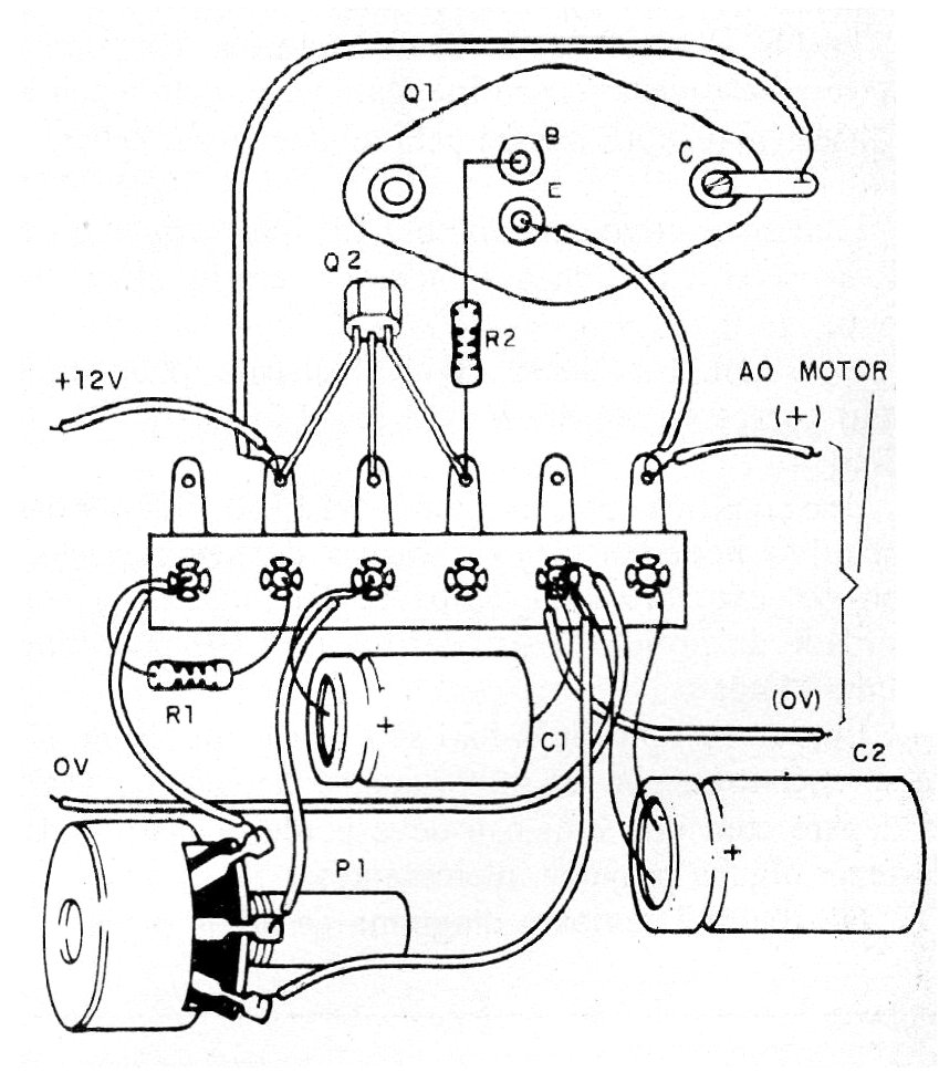 Este control utiliza dos transistores y puede controlar motores de corriente continua de 3 a 15 V con corriente máxima del orden de 3 A. El control es del tipo lineal y el transistor de potencia debe montarse en un buen radiador de calor.