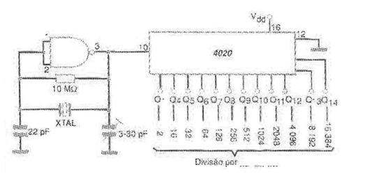 Conforme muestra la figura, aplicando la señal en la entrada de este CI la frecuencia quedará dividida por potencias de 2, con la posibilidad de obtener la división por hasta 16 384.