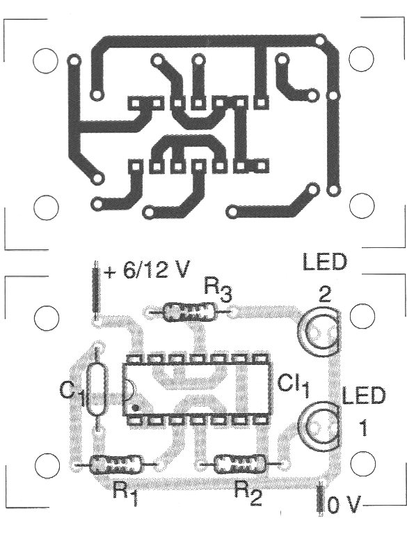 El oscilador mostrado en la figura 1 puede accionar tanto dos LEDs separados como un LED bicolor en una frecuencia que depende tanto de R1 y R2.