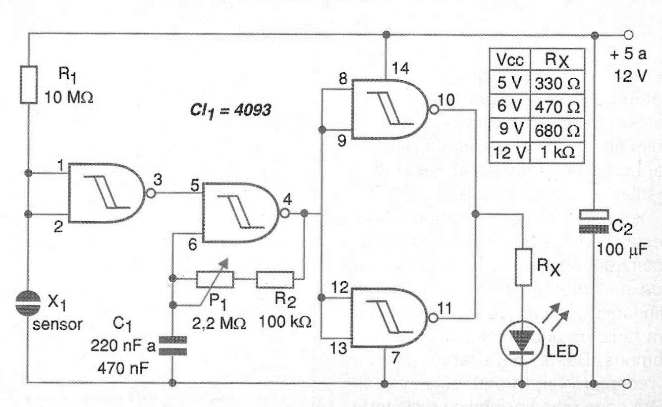 Dos pedazos de hilos descascados o dos planchas de metal se utilizan como sensor en el circuito de la figura 1.