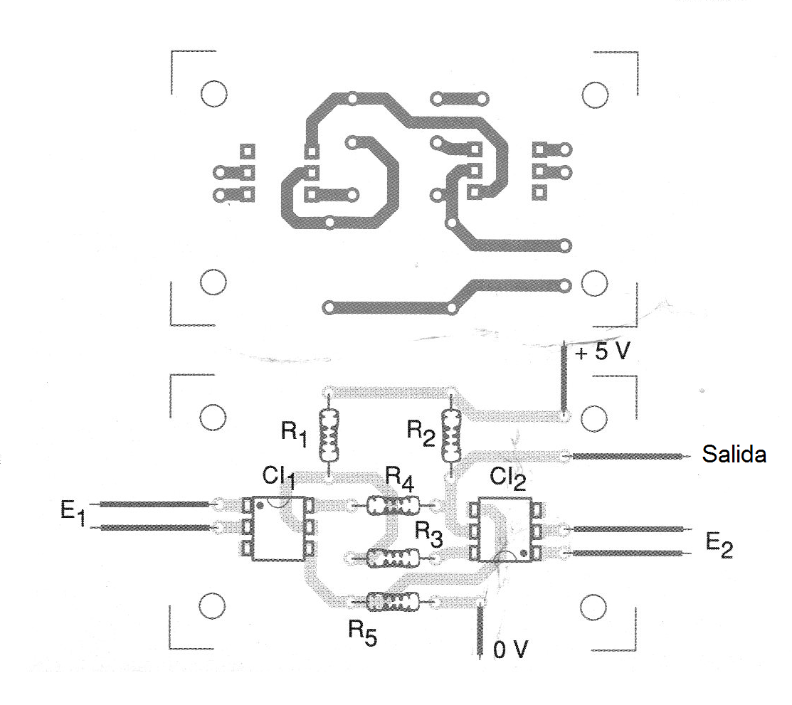 En la figura 2 tenemos una sugerencia de placa de circuito impreso para la implementación de este flip-flop R-S.