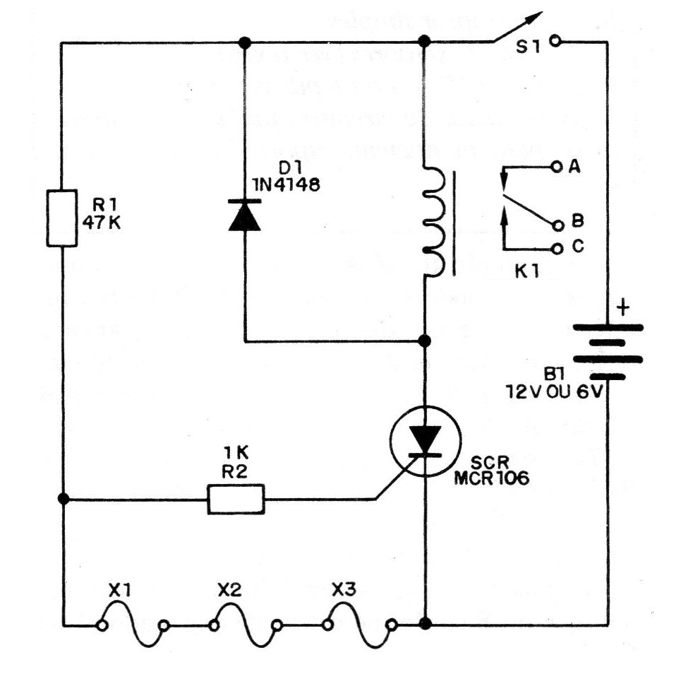 En la condición de espera todos los hilos están interconectados, aterrizando el comportamiento del SCR. Si hay una interrupción de uno de ellos, el SCR dispara, activa el relé y con ello se alimenta el sistema de alarma.