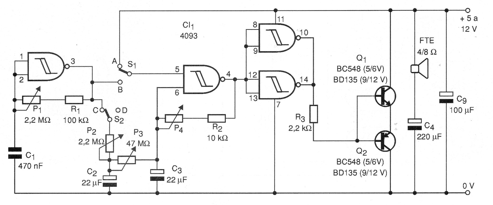 En este circuito tenemos dos osciladores interdependientes formados alrededor de dos de las puertas NAND del 4093. El primer oscilador genera intermitencias que son controladas por P1. Las llaves S1 y S2 aplican la señal de este oscilador al siguiente oscilador que genera un tono de audio cuya frecuencia es controlada por P4.