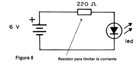 Los LEDs sólo tienen por especificación la corriente ya que la tensión siempre está entre 1,8. y 2,1 V. Esto significa que los LED no se pueden conectar directamente a las pilas o baterías que proporcionan tensiones mayores que estos valores, ya que esto causa su quema. Los LED sólo se deben utilizar en combinación con componentes que puedan limitar la corriente que los atraviesa. Estos componentes son resistores, como se muestra en la figura 8.