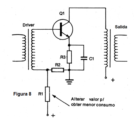 En la figura 8 tenemos otro resistor que polariza el transistor excitador y que puede tener su valor alterado sensiblemente para obtener el menor consumo de corriente sin distorsión.