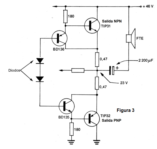 Si la etapa es en simetría complementaria, como muestra la figura 3, además de medir las tensiones en los transistores, vea también si el capacitor conectado al altavoz está en buenas condiciones.