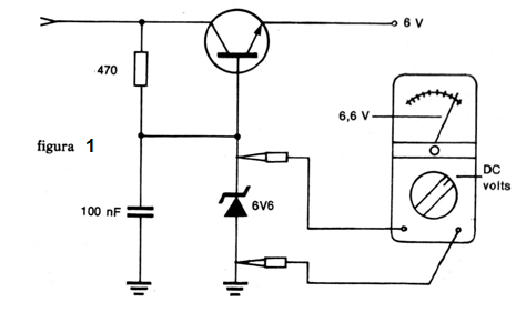 En un circuito en el que existe un regulador con zener debemos encontrar entre sus terminales, cuando medidos con el voltímetro, la tensión zener, como muestra la figura 1.