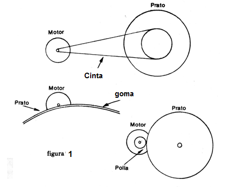 Para tocadiscos y tocadiscos comunes debemos analizar el sistema de transmisión de movimiento, que puede ser por polea, correa o aún por contacto. En la figura 1 mostramos las tres posibilidades indicadas.