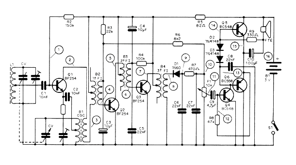 En la figura 1 tenemos una radio común transistorizada con puntos de análisis de las señales. Cada transistor corresponde a un paso. Del punto 1 al 8 tenemos señales de RF y del 8 al 16 tenemos señales de audio.