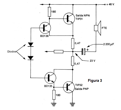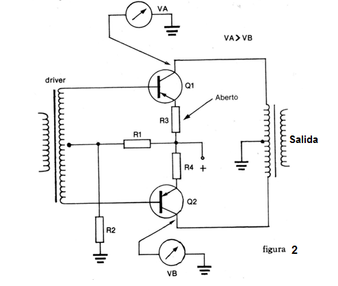 Si la etapa es en simetría complementaria, como muestra la figura 3, además de medir las tensiones en los transistores, vea también si el condensador conectado al altavoz está en buenas condiciones.