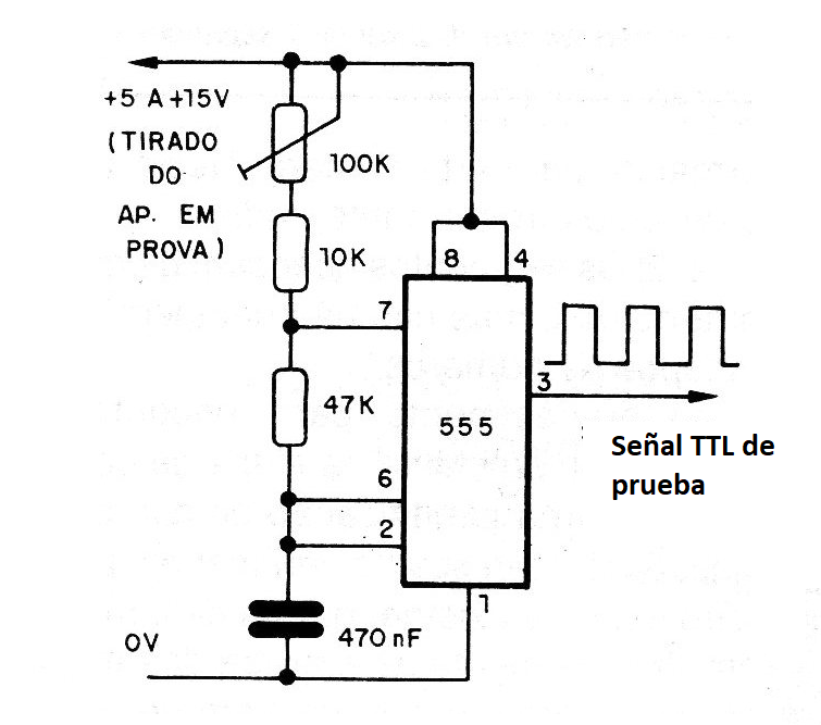 La alimentación de este oscilador, de 5 a 15 V, puede ser retirada del propio circuito en prueba. Si las pulsos están presentes, pero no hay recuento, entonces deberemos verificar los circuitos integrados.