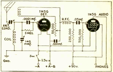Este receptor de onda corta de tipo regenerativo simple se encontró en la documentación de 1942. Tenga en cuenta las tensiones de suministro. El rango sintonizado depende de la bobina y los auriculares deben ser de alta impedancia con al menos 2000 ohms. La antena debe ser larga.