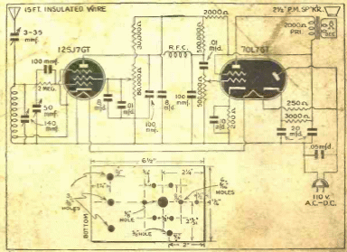Este circuito fue publicado en una revista de 1943 siendo alimentado por la red eléctrica. El circuito es para el rango de onda media del tipo reflejo. Ver que la escucha sea por altavoz. La antena externa debe usarse para estaciones más débiles.