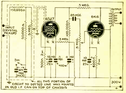 Este pequeño amplificador de 2 válvulas para fonocaptores de cristal se obtuvo a partir de documentación de 1944. El circuito tiene una potencia de unos 2 watts y la fuente de alimentación de 300 V no está incluida.