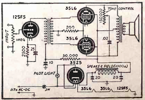 Aquí hay un buen amplificador de alta fidelidad con solo 4 válvulas y alimentación de red con una fuente de alimentación sin transformador. Los filamentos de la válvula están conectados en serie y la salida en contrafase.