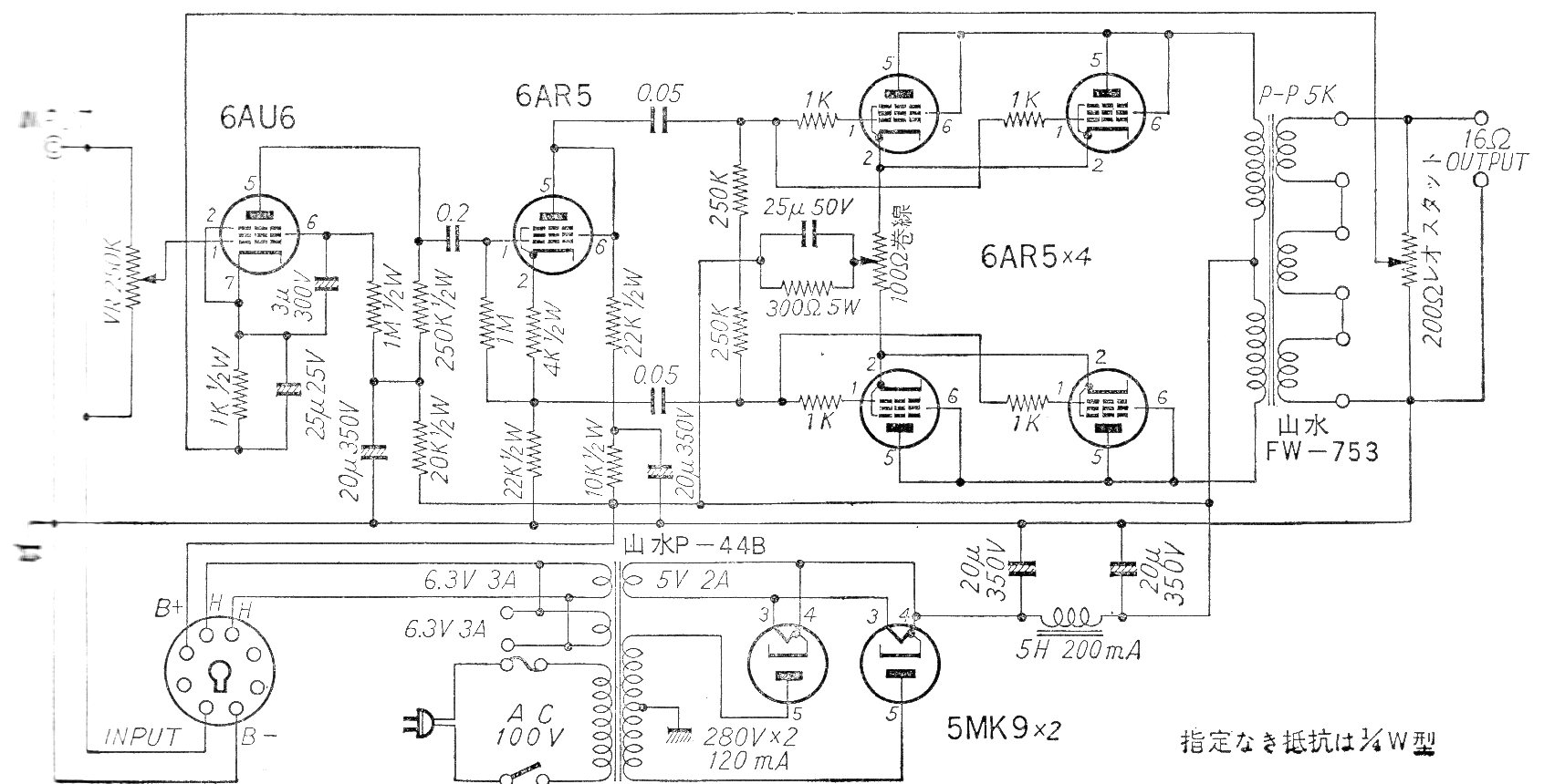 Este amplificador de potencia tiene una potencia del orden de algunos watts utilizando válvulas 6AR5 en push-pull en la salida. El circuito incluye fuente de alimentación con dos válvulas rectificadoras. Encontramos el diagrama en una documentación japonesa de los años 60.