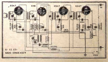 Este circuito sintoniza las emisoras de onda media para que su sonido se obtenga en un amplificador de alta fidelidad. El circuito es de 1944. El circuito tiene 4 válvulas y no tiene la fuente de alimentación indicada.