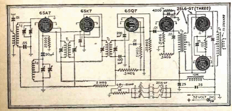 Este circuito de 6 válvulas es de una publicación de 1945. El circuito es un súper heterodino para el rango de onda media con una salida push-pull para aumentar la potencia.