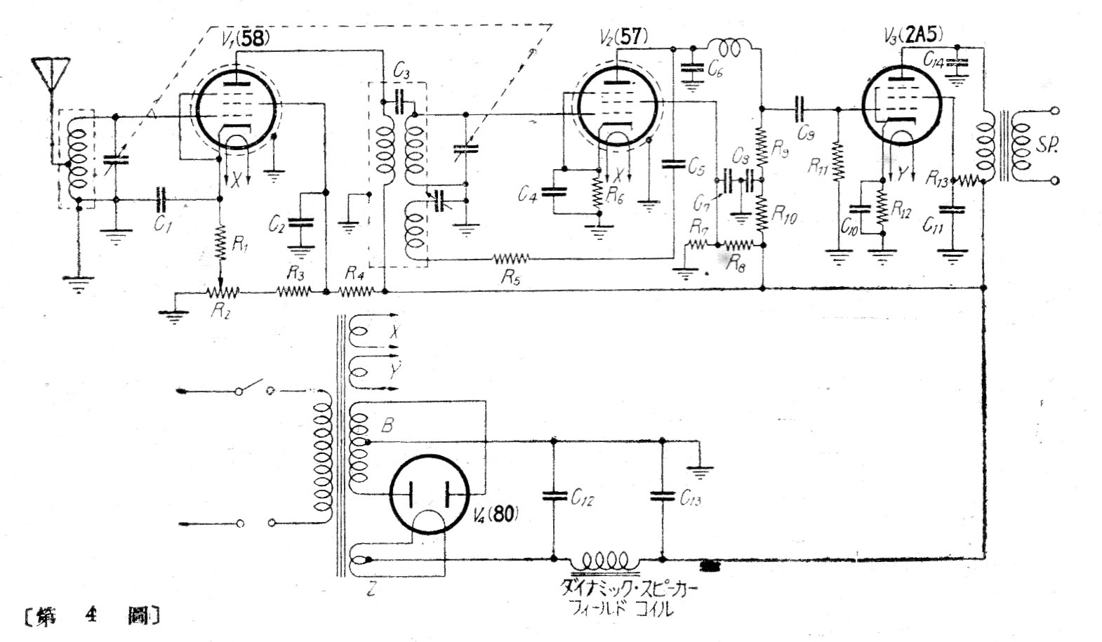 Encontramos este receptor de 4 válvulas en una publicación japonesa de los años 40. El circuito utiliza fuente con válvula rectificadora de modo que los elementos activos son sólo 3 válvulas. Los detalles de las bobinas no se dan y la potencia de audio es del orden de 1 o 2 watts. Los valores de los componentes no se suministran, pero pueden ser deducidos por el análisis de circuitos equivalentes.