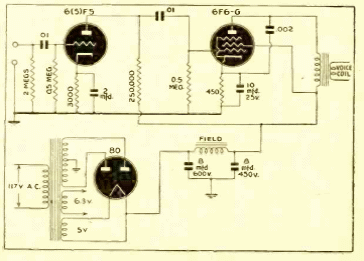 Este circuito de solo 3 válvulas tiene una potencia de unos pocos watts. Encontrado en una publicación de 1943. Se incluye fuente de alimentación con transformador y doble diodo.