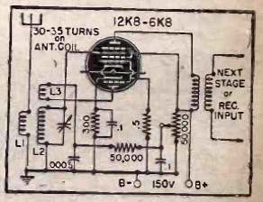 Este circuito se utiliza en los receptores para aumentar la intensidad de la señal. El circuito es de una documentación de 1945. Hace uso de un oscilador de radio común y una válvula convertidora de la época. Se indican las tensiones de alimentación.