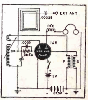 Este receptor de válvula de filamento de 1V se encontró en una documentación de 1945. Utiliza antena de cuadro y antena externa al mismo tiempo. La configuración súper regenerativa alimenta un auricular de alta impedancia.