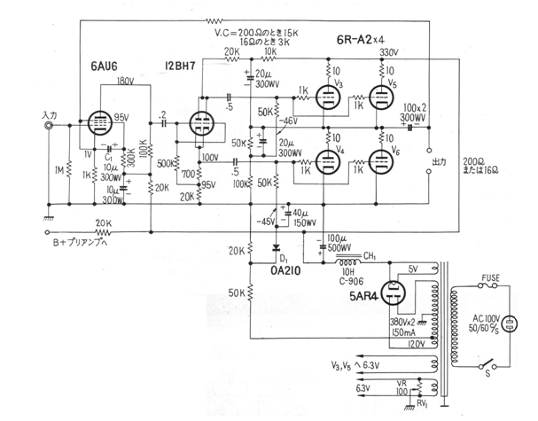 Este es el circuito de un amplificador valvular comercial de 1961. El circuito se caracteriza por tener una salida de baja impedancia, de este modo eliminando el transformador de salida. La fuente de alimentación se proporciona junto con el diagrama.