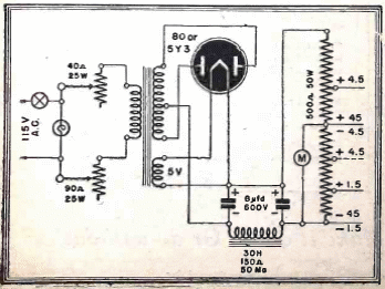 Este circuito para suministrar tensiones para un voltímetro u otra aplicación se encontró en una publicación de 1944. El circuito usa un transformador y una válvula 5Y3 que ya estaba en uso en ese momento.