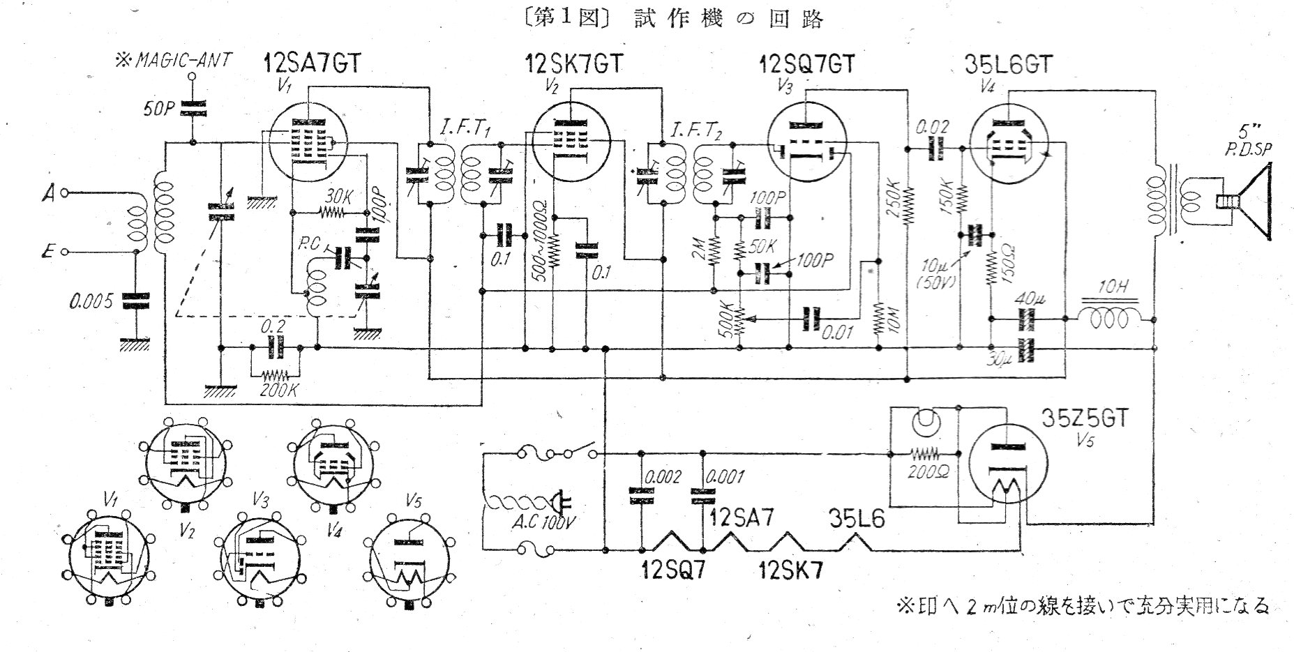 Este receptor de calentamiento directo de los filamentos con las válvulas conocidas 35Z5 y 35L6 en la salida fue encontrado en una publicación japonesa muy antigua. El circuito es para el rango de AM y el FI es de 455 kHz. La red de energía en Japón en la época era de 100 V.