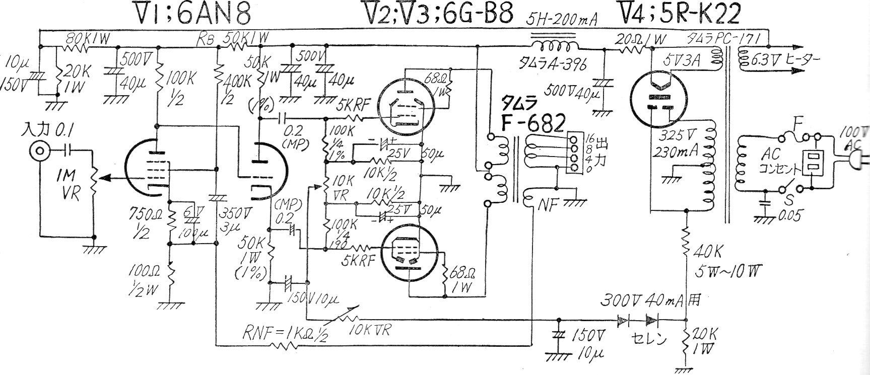 Este amplificador de 18,5 W con la válvula 6GB8 fue encontrado en una documentación japonesa de los años 60. El circuito tiene dos válvulas en push-Pull en la salida con un transformador de alta fidelidad. La fuente de alimentación está incluida.