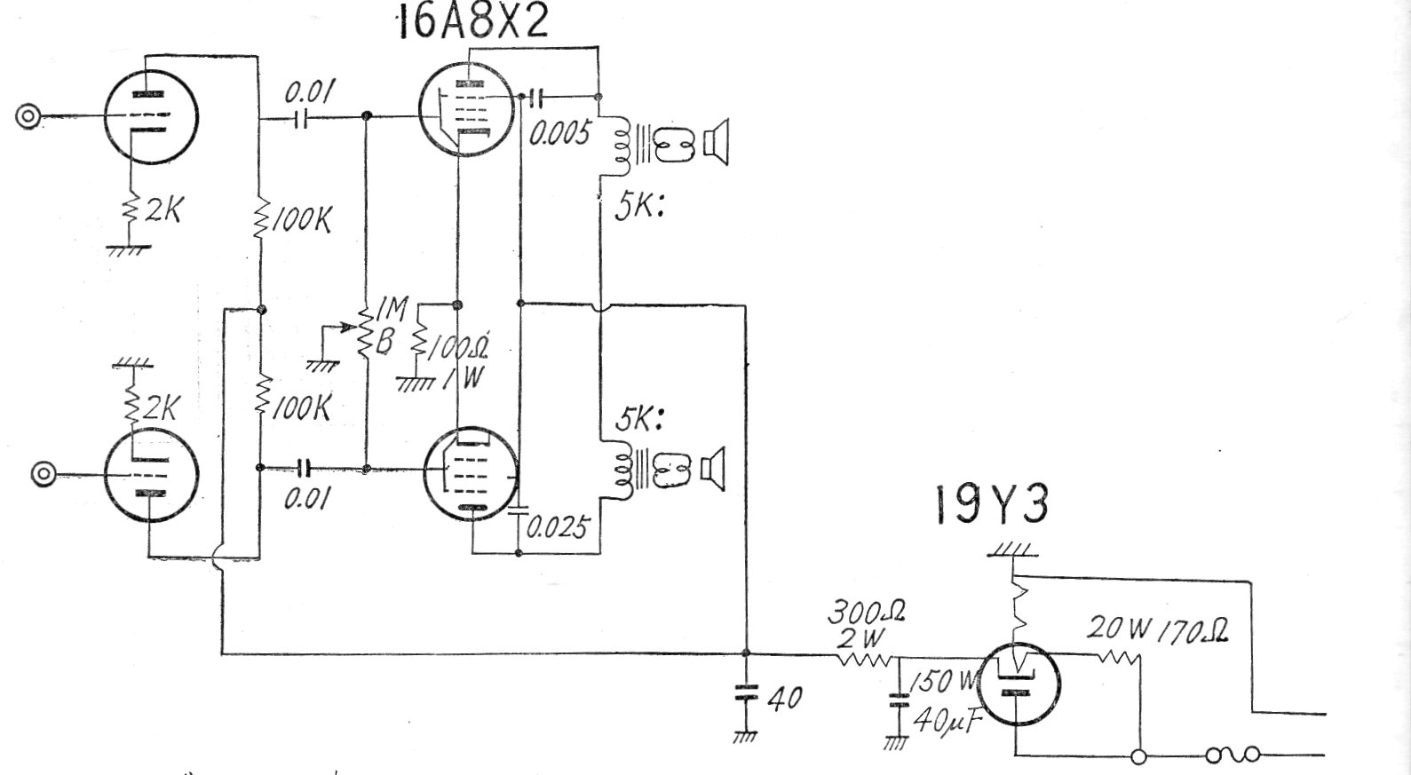 Este pequeño amplificador estéreo sin transformador en la fuente de alimentación fue encontrado en una documentación japonesa de los años 60. El circuito utiliza los filamentos en serie y tiene una potencia de pocos vatios. El circuito era usado en tocadiscos de los años 60. La red japonesa en la época era de 100 V.