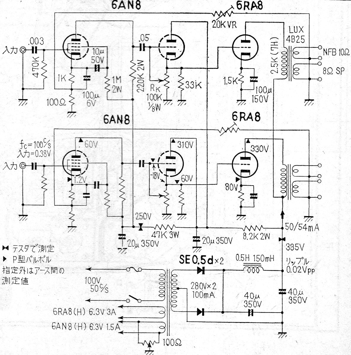Este circuito es un poco más elaborado que el posterior (V888S) pues incluye una etapa de preamplificación adicional. El circuito es de la misma documentación japonesa de 1968 y los componentes usados no son comunes actualmente. La potencia es de algunos watts por canal.