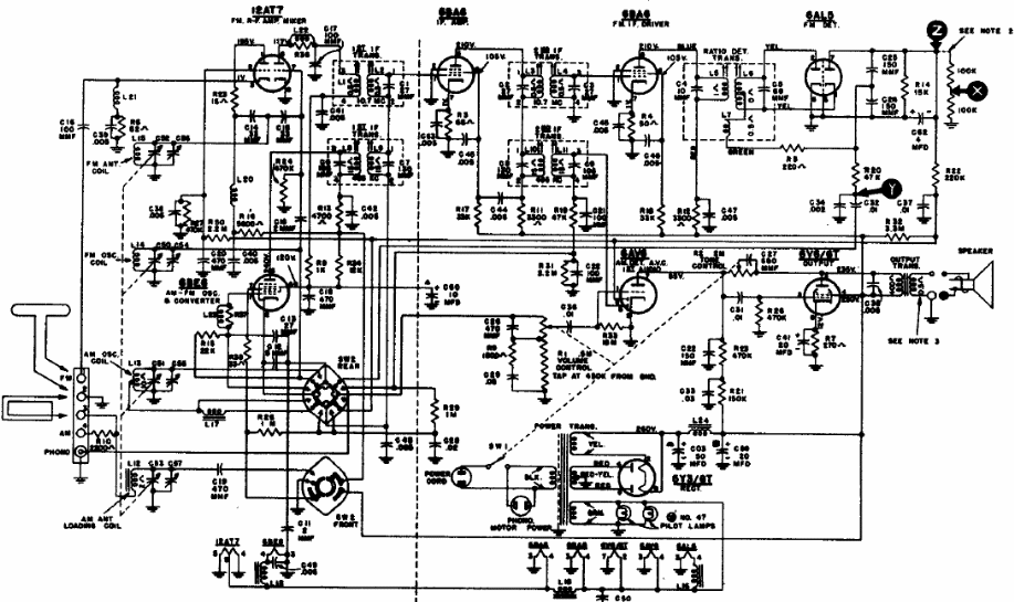 Este receptor para as duas faixas foi encontrado num manual da época. O circuito utilizava transformador na fonte e tinha FI de 10,7 MHz para a faixa de FM.