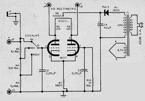 El circuito que presentamos fue encontrado en una publicación de 1962. Básicamente consta de una etapa diferencial con muy alta impedancia de entrada que permite utilizar un multímetro común como voltímetro electrónico con una impedancia de entrada muy alta. El circuito tiene escalas de 4 V, 40 V y 400 V conmutadas por un interruptor. La precisión dependerá de las resistencias que formen el circuito divisor de entrada. La válvula es de doble triodo y, además, el componente crítico del proyecto es el transformador, que sin embargo tiene sólo 15 mA de corriente en el devanado de alta tensión y por lo tanto permite varias soluciones en paralelo como las sugeridas en el artículo V009. El potenciómetro sirve como ajuste nulo, para restablecer la escala del multímetro en ausencia de voltaje de entrada. Tenga en cuenta que, al ser un circuito de válvulas con una impedancia de entrada muy alta, es sensible a los zumbidos.