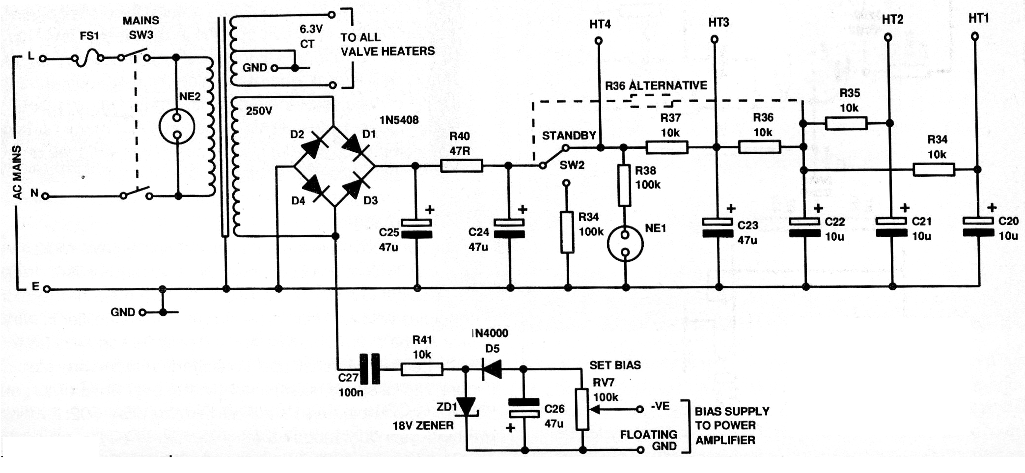 Esta es la fuente de alimentación para el preamplificador descrito en otro articulo del sitio. El circuito tiene por elemento crítico el transformador y en lugar de válvula rectificadora, se emplea una solución moderna que no afecta la calidad de sonido, que es el uso de diodos rectificadores. Observe que las tensiones en este circuito son altas.