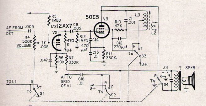 El esquema que se muestra a continuación se obtuvo de una revista Radio Electronics de 1961 y muestra cómo una radio AM de tubo común y de bajo costo se puede transformar en un transceptor AM inalámbrico y así servir como intercomunicador doméstico con un alcance de unas pocas decenas de metros. La bobina está formada por 50 + 50 vueltas de alambre 28 AWG en un tubo de PVC o madera de 2 a 2,5 cm de diámetro. La antena consta de un trozo de cable común de 1 o 2 metros de largo. El circuito fue adaptado de una radio con un tubo 50C5 en la salida, pero cualquier radio con un pentodo en la salida se puede modificar de la misma manera. L2 consta de 10 vueltas del mismo cable sobre L1. Con la llave en posición T transmite y en posición R recibe las señales.