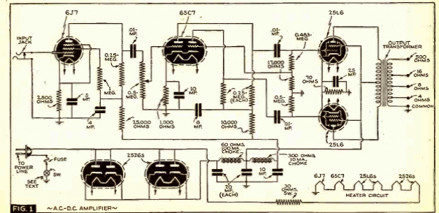 Encontrado en una publicación de 1941, este buen amplificador de potencia no usaba una fuente de alimentación con transformador, pero debido a la corriente de la válvula tenía dos válvulas dobles en la fuente de alimentación. El circuito se indicó como una solución económica para el sonido ambiental. Tenga en cuenta la válvula de doble triodo utilizada como un cambiador de fase para impulsar la salida.
