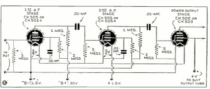 Este interesante circuito de un Radio Craft de la década de 1940 muestra una aplicación de tubos de nueva creación con filamento de 5/8 V. El circuito destinado a aplicaciones especiales ultraminiaturizadas utilizaba válvulas extremadamente pequeñas con filamento de muy bajo voltaje. En la figura tenemos un circuito de aplicación en un amplificador.