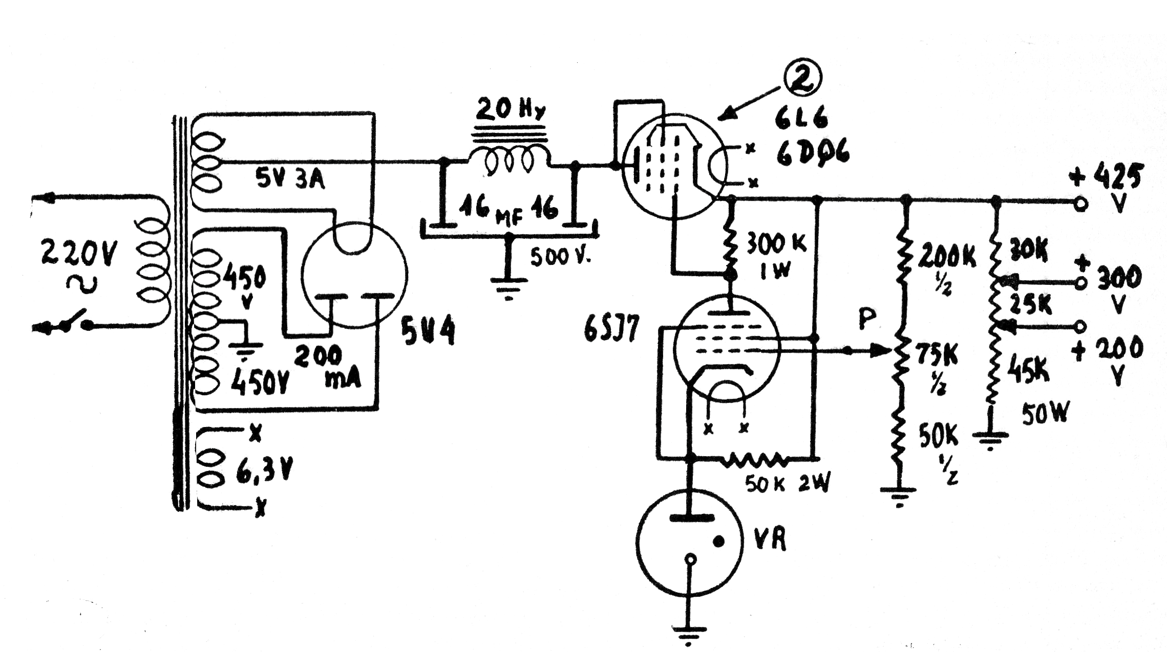Esta fuente valvulada, sugerida en un antiguo manual de la RCA, proporciona una salida regulada de varias tensiones que se deben ajustar en un potenciómetro de hilo. La válvula reguladora que sirve de referencia (un zener-válvula) es la VR, normalmente con tensiones de referencia alrededor de 100 V. Así, en P se puede ajustar la tensión de salida. Los componentes críticos son las válvulas, transformador y choque de filtro además de los potenciómetros de hilo en los valores indicados.