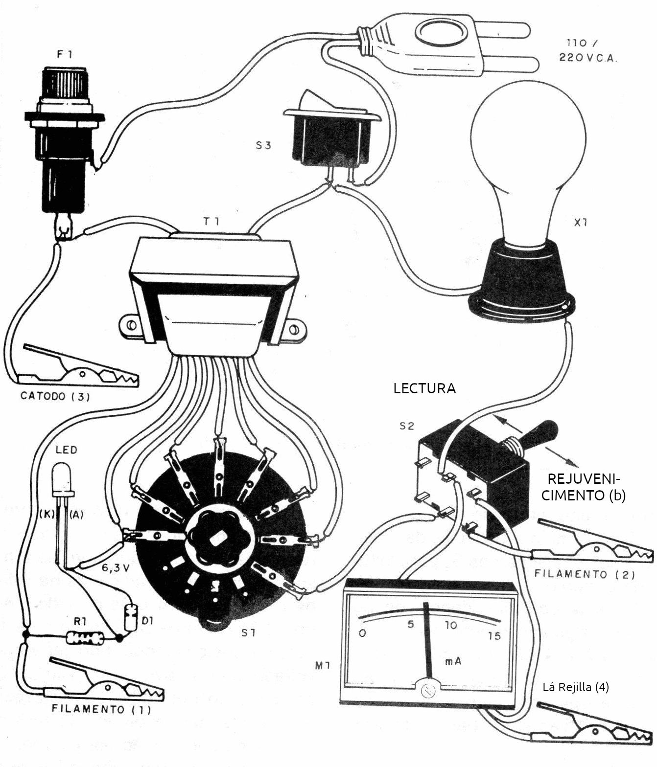 La llave S1 es giratoria con 1 polo x 7 posiciones, y se puede utilizar una llave de 1 polo x 10 posiciones de un antiguo estabilizador de tensiones manual o se puede utilizar la técnica de conmutación de plugue. S2 consta de una llave H que está conectada de tal manera que el filamento se desconecta cuando el amperímetro se conecta al circuito.
