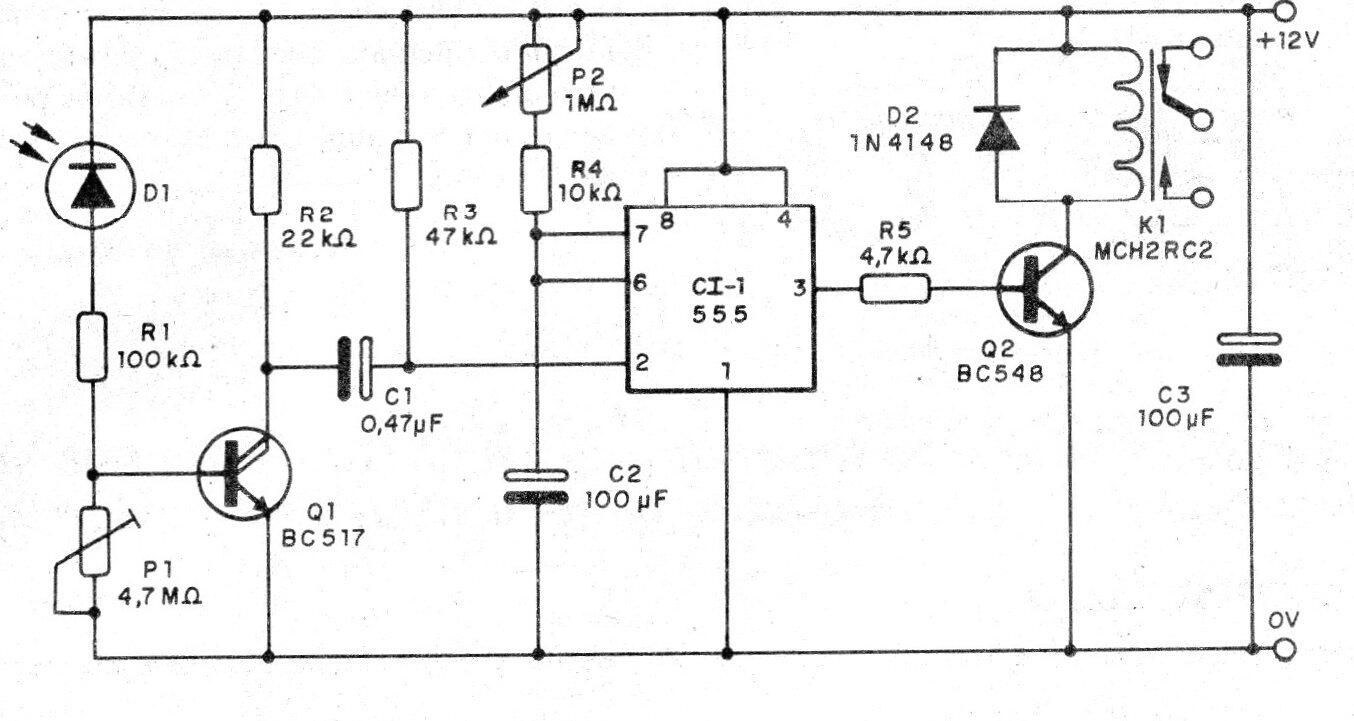 Dejando ahora incidir luz sobre D1 debe ocurrir el disparo del relé que permanecerá por algunos segundos. Cada vez que la luz incidir el relé se activará.