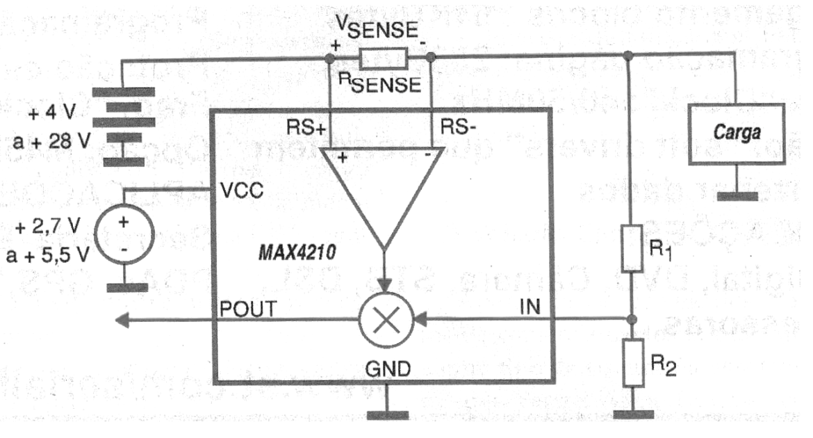 Los resistores R1 y R2 programan la tensión que se obtendrá en la salida en función de la potencia en la carga para que un dispositivo de protección sea accionado. La otra alternativa para un circuito de protección es dada por el MAX4211, cuya configuración básica se muestra en la figura 3.