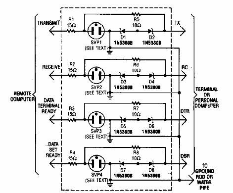 Este circuito es de una vieja Electroics Now. Su propósito es proteger las líneas de fax y módem de dos computadoras de la época. Los supresores son tipos de tiempo.