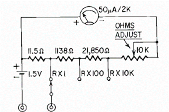 Combinado con los dos circuitos anteriores, podemos crear un multímetro simple con este circuito. El cálculo de los componentes se realiza para un instrumento de 50 uA con una resistencia de 2k. La selección de pistas se realiza mediante una tecla y la alimentación se realiza mediante pilas.