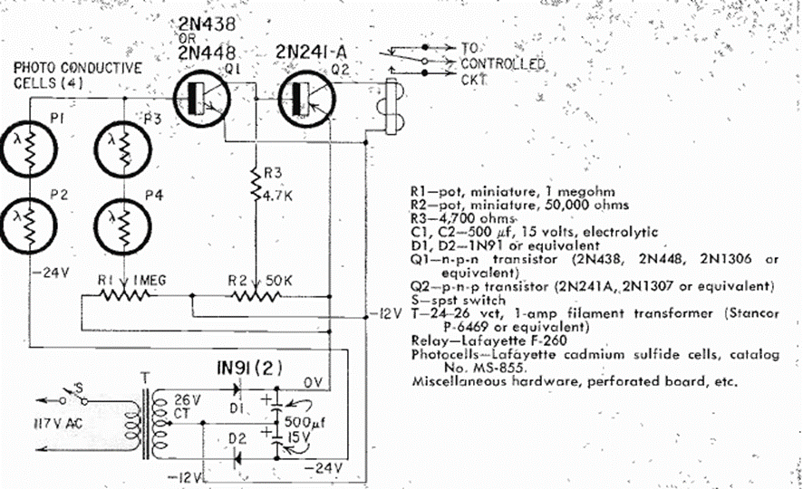 Este circuito tuvo su ensamblaje descrito en Radio Electronics de julio de 1964. El circuito utiliza LDR ajustados para tener una referencia y así servir como sensor de contraste. El circuito activa un relé y se alimenta de una fuente de 12 V.