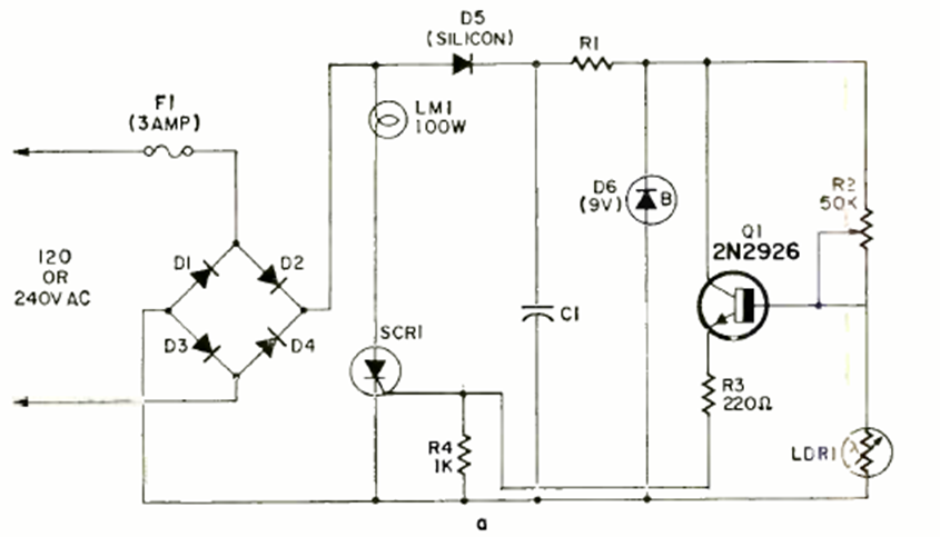Este circuito apareció en la revista Radio Electronics en julio de 1969. El sensor es un LDR y el circuito es un control de onda completa. Los diodos deben estar de acuerdo con la potencia de la lámpara, así como con el SCR.