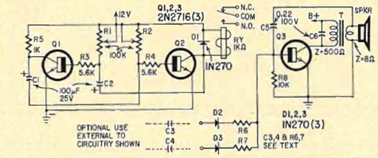 Este circuito temporizador e indicador lo encontramos en una revista de Radio Electrónica de febrero de 1967. Los transistores son de la época y la alimentación se suministra mediante una batería o fuente de 12 V.